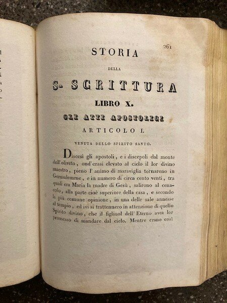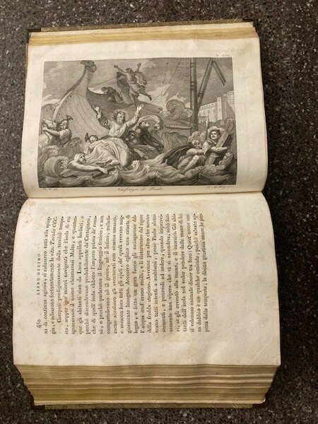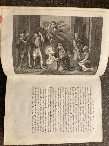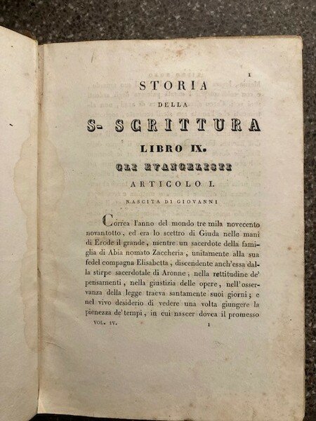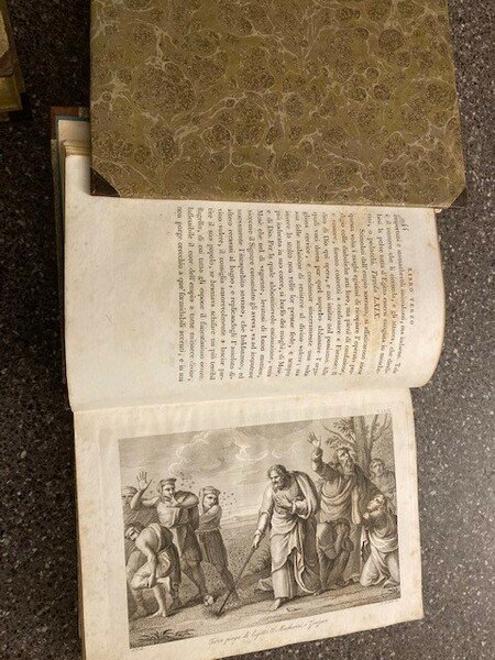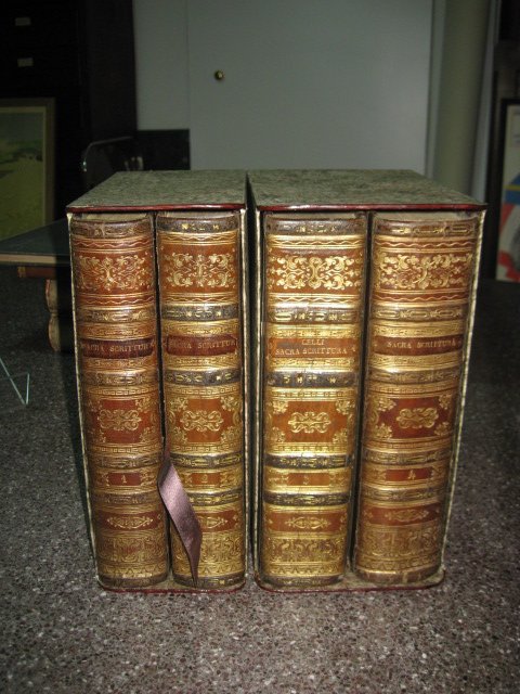4 voll. in-4° (270x200mm), pp. 407, (1); 450; 650, (2); 567, (1); legatura coeva m. pelle marrone e angoli con titolo, tomaisons e ricchissimi fregi ornamentali in oro su dorsi a falsi nervi. Piatti marmorizzati, sguardie azzurre. Frontespizi incisi da Domenico Feltrini con vignette sacre. Complessive 300 tavole incise su rame f.t. da svariati artisti (Ceracchi, Bianchi, Mochetti, Mannelli) da disegni di Napoleone Valentini (talora da dipinti sacri di grandi nomi della storia dell'arte come Raffaello) raffiguranti i principali episodi delle Sacre Scritture e una carta della Terra Santa f.t. al secondo vol. Sparse gore e fioriture, ma bell'esemplare conservato entro duplice custodia in cartone marmorizzato. Prima edizione, rara a trovarsi completa di tutto il suo corredo iconografico.