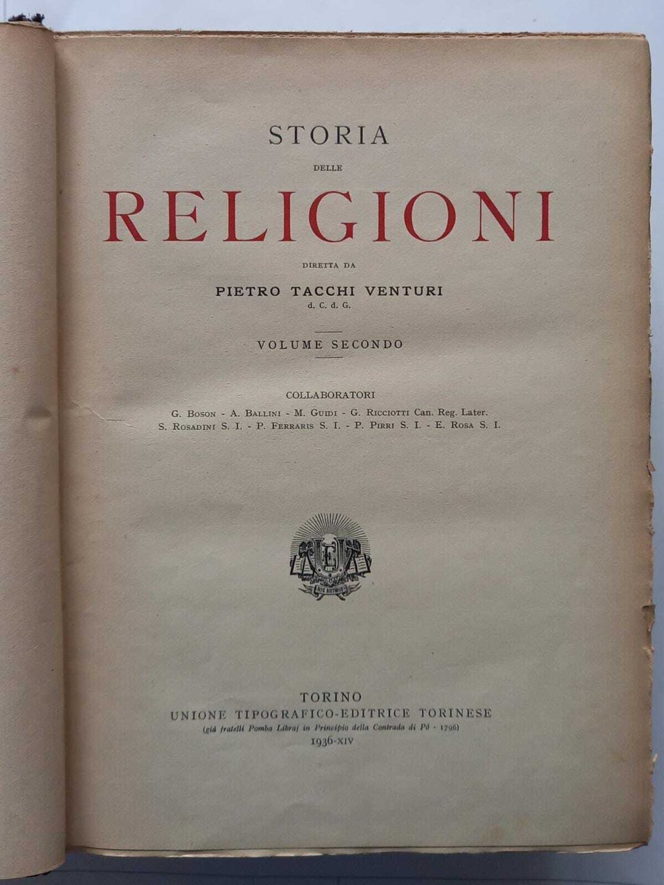 Storia delle Religioni in 2 volumi diretta da Pietro Tacchi Venturi. Le copertine editoriali riportano importanti segni del tempo e di usura sui dorsi e sui piatti, piccoli tagli e mancanze, gli interni sono ingialliti con segni di fioriture e sottolineature a lapis, in prima pagina firme di proprietà e schizzi a matita.  632, 839 Mediocre (Poor) .