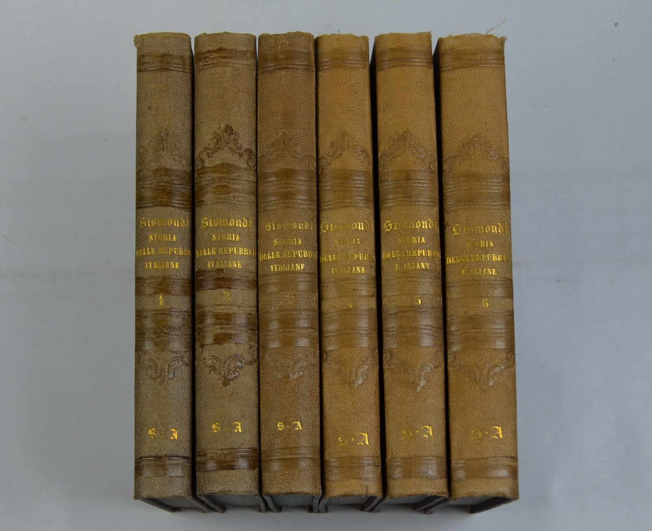 Sei volumi di cm. 22,5, pp. 3000 ca. complessive. Frontespizio inciso a ciascun volume preceduto da una bella antiporta illustrata, diversa a ciascuna delle sei parti. Solida legatura del tempo in piena percallina con titoli in oro ai dorsi. Esemplare genuino e ben conservato. Classico della storiografia italiana.