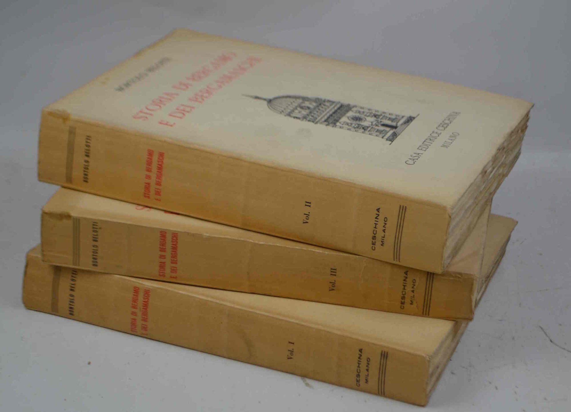 Tre volumi di cm. 25,5, pp. 658 (2); 850 (2); 667 (5). Brossura originale illustrata. Esemplare in ottimo stato di conservazione, a fogli chiusi. Prima edizione, non comune, di quest'opera fondamentale per la storia della città di Bergamo.