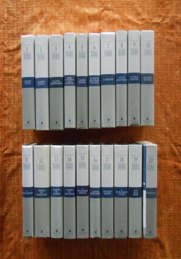 Coperta cartonata rigida illustrata, formato cm. 22 x 15. Illustrazioni in bianco nero e a colori fuori testo in tutti i volumi. I titoli sono i seguenti:- vol. 1: L’ANTICO EGITTO- vol. 2: LA GRECIA CLASSICA- vol. 3: LE CIVILTA’ MESOPOTAMICHE- vol. 4: ROMA DALLE ORIGINI ALL’ETA’ REPUBBLICANA- vol. 5: L’IMPERO ROMANO- vol. 6: LA NASCITA DELL’EUROPA CRISTIANA- vol. 7: IL MEDIOEVO- vol. 8: L’ETA’ DI CARLO MAGNO- vol. 9: LA CIVILTA’ BIZANTINA- vol. 10: LA CIVILTA’ DEI MAYA- vol. 11: IL RINASCIMENTO- vol. 12: L’EUROPA DEL CINQUECENTO- vol. 13: L’EUROPA DEL SEICENTO- vol. 14: L’EUROPA DEL SETTECENTO- vol. 15: LA RIVOLUZIONE FRANCESE- vol. 16: L’IMPERO NAPOLEONICO- vol. 17: L’ETA’ DELLE NAZIONI- vol. 18: IL RISORGIMENTO ITALIANO- vol. 19: L’ETA’ DEGLI IMPERI- vol. 20: IL XX° SECOLOTutti i volumi sono in ottime condizioni/pari al nuovo. SN