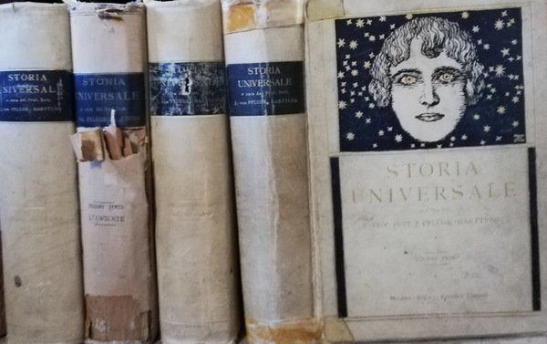 Opera incompleta, mancante di due volumi, edita con il concorso di eminenti collaboratori. Vol. I: L'Evo antico, edito nel 1914, 690 pagine con 409 figure nere e colorate, 39 tavole aggiunte e 8 carte geografiche. Vol. II: Medio-Evo, edito nel 1916, 720 pagine con 371 figure nere e colorate, 38 tavole aggiunte e 7 carte geografiche. Vol. III: L'Oriente, edito nel 1924, 687 pagine con 401 figure nere e colorate, 37 tavole aggiunte e 6 carte geografiche. Vol. V: Storia moderna 1650-1815, edito nel 1915, 768 pagine con 503 figure nere e colorate, 43 tavole aggiunte e 6 carte geografiche. Legatura in tela chiara, con titoli e fregi in nero ed oro al piatto ed al dorso, su quest'ultimo in alcuni casi poco leggibili, scurita e consumata dal tempo, con usura lungo i margini, strappi alle cuffie ed ai dorsi, bordi stanchi, piccoli aloni ed, al vol I con scotch alla cima ed al piede del dorso ed al vol. III con evidente strappo e mancanza sempre al dorso. Tagli colorati di nero; pagine ingiallite, con ampio margine e con illustrazioni anche su tavole ripiegate, alcune protette da velina e ricavate da antichi documenti. Al vol. V alone di umidità ai margini.