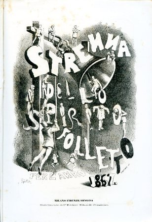In 8 grande, pp. 160. Brossura rifatta (la brossura posteriore, elegantemente illustrata da Giulio, è originale). Contiene numerosissime incisioni e litografie a piena p. di Gonin, Giulio, Vajani ed altri caricaturisti. Buon esemplare. Celebre strenna satirica della rivista Lo spirito folletto, stampata da Sonzogno e figlia di quella prima rivista nata a Milano il 1° maggio 1848 per iniziatica di Caccianiga e Greppi e che visse l'effimero periodo della libertà milanese. Gianeri, Due lustri di giornalismo satirico in Piemonte, p. 55.