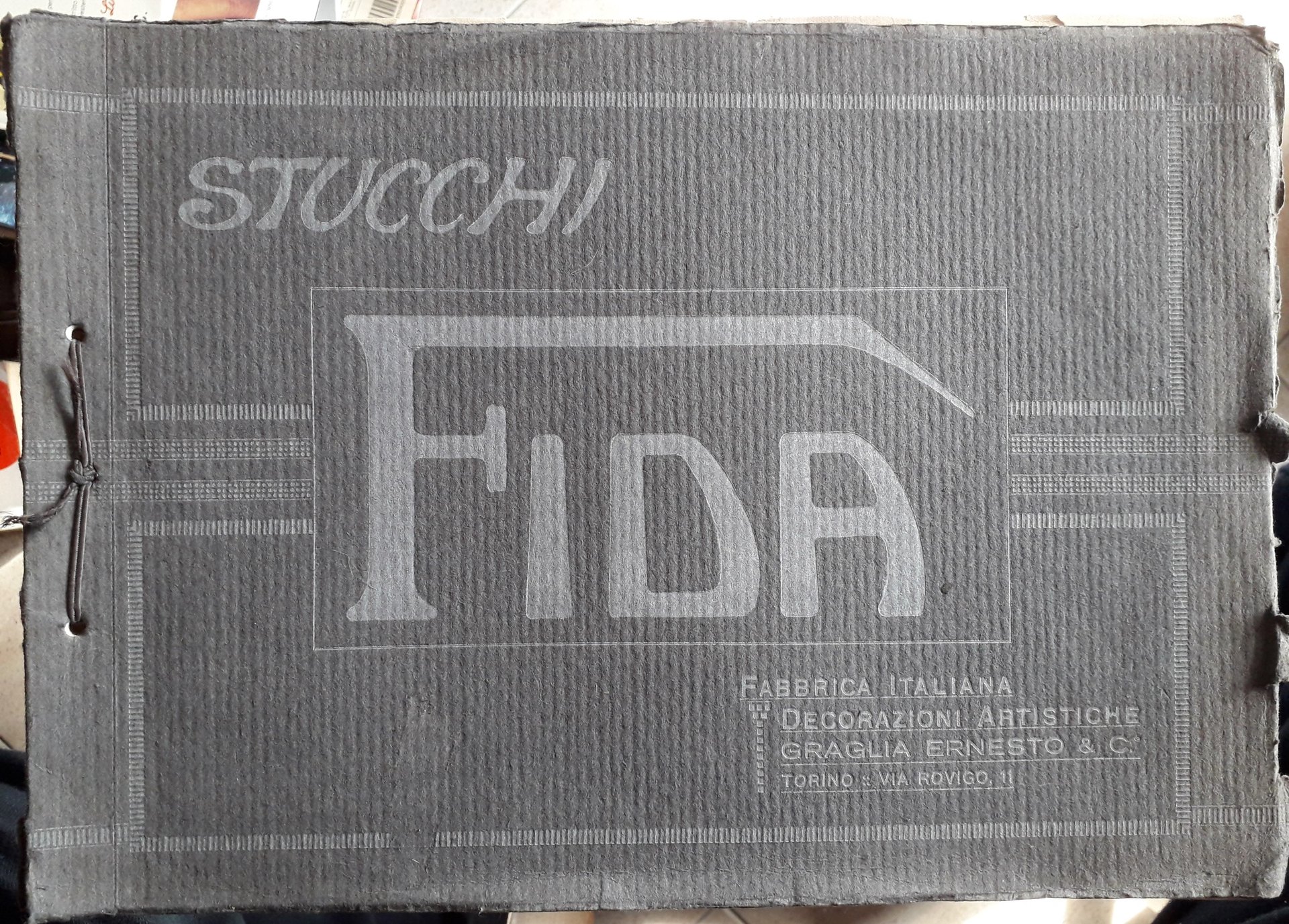 Albo oblungo di mm. 245x345, legato con cordoncino passante per due fori, catalogo non datato tuttavia posteriore al 1922 e prob. non oltre il 1930, 1 pag. con informazioni sulla ditta e con un timbro rosso col n° di telefono, seguono 31 tavole con 2 foto per pag. di es. di stucchi. Ottimo.