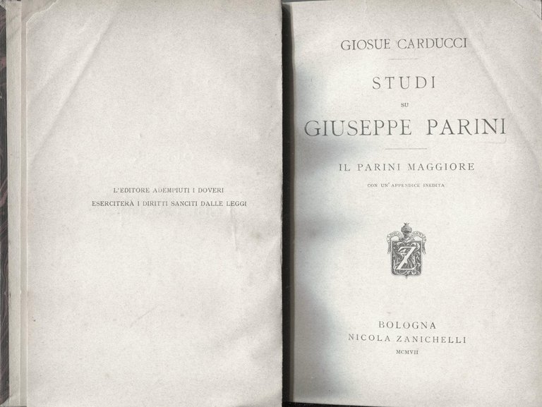 Studi su Giuseppe Parini. Il Parini maggiore | Libri antichi e moderni | CARDUCCI, Giosué (Val di Castello, Pietrasanta 1835 - Bologna