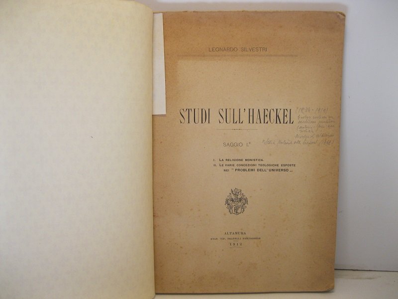 Studi sull'Haeckel. Saggio I. La religione monistica. II. Le varie concezioni teologiche esposte nei 'Problemi dell'universo' | Libri antichi e moderni | Silvestri Leonardo