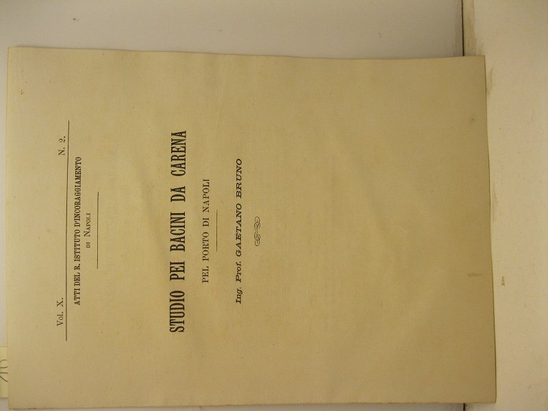 In 4, pp. 21 + (3b) con 2 tavv. f.t. di cui una raff. la planimetria d'insieme (limite del porto militare, limite di omeggio delle grandi navi commerciali, rotta per uscire dal porto dopo successive manovre. rotta di entrata); e l'altra con il particolare della darsena con due bacini e della darsena con un unico bacino a doppio ingresso. Br. rifatta con carta d'epoca. Stralcio dagli Atti del Real Istituto d'incoraggiamento alle scienze naturali di Napoli, tomo X, quarta serie. Secondo studio di Gaetano Bruno su un nuovo progetto per bacini da carena del porto di Napoli di cui era uscita gia' una prima parte (con valore autonomo) negli Atti dello stesso istituto nel 1895.