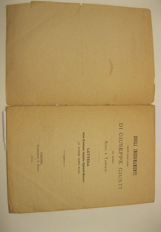 Sugli insegnamenti tratti dalle opere di Giuseppe Giusti dai signori Biagi e Tanfani. Lettera della contessa Isabella Cabardi Brocchi | Libri antichi e moderni | Cabardi Brocchi Isabella