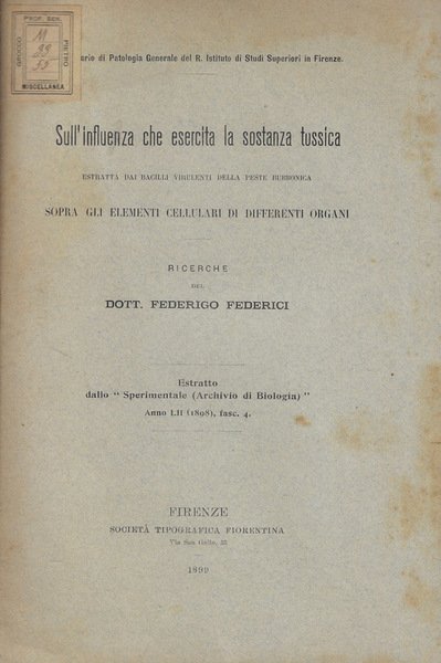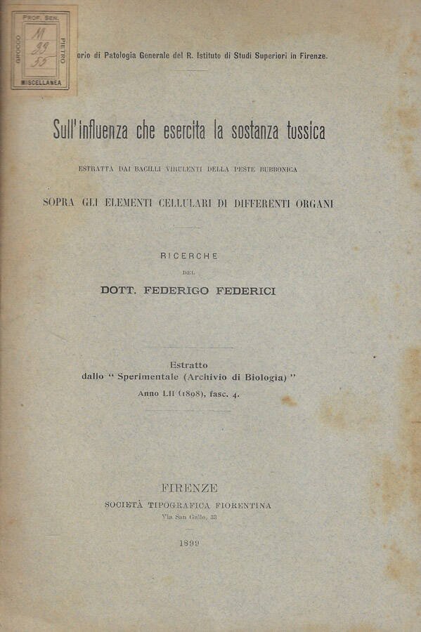 Sull'influenza che esercita la sostanza tossica estratta dai Bacilli virulenti della peste bubbonica sopra gli elementi cellulari di differenti organi | Libri antichi e moderni | Federigo Federici