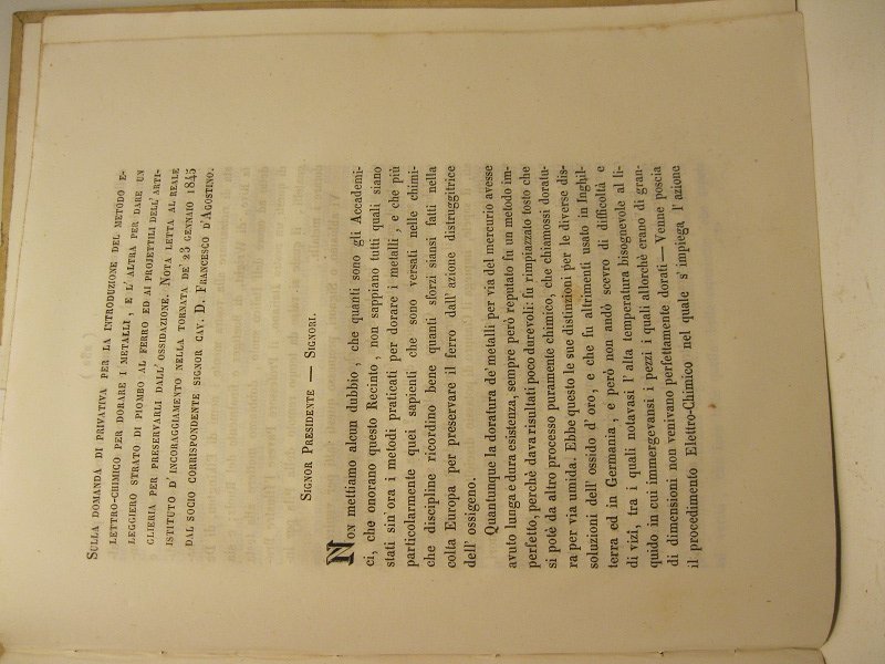 Sulla domanda di privativa per la introduzione del metodo elettrico-chimico per dorare i metalli e l'altra per dare un leggero strato di piombo al ferro e ai proiettili dell'artiglieria per preservarli dall'ossidazione | Libri antichi e moderni | D'Agostino Francesco