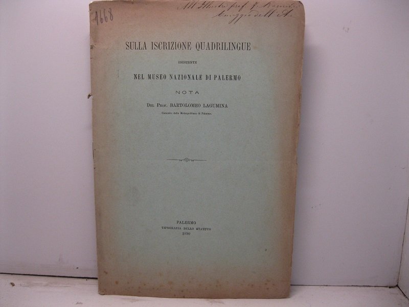 Sulla iscrizione quadrilingue esistente nel museo nazionale di Palermo. Nota del Prof. Bartolomeo Lagumina canonico della Metropolitana di Palermo | Libri antichi e moderni | Lagumina Bartolomeo