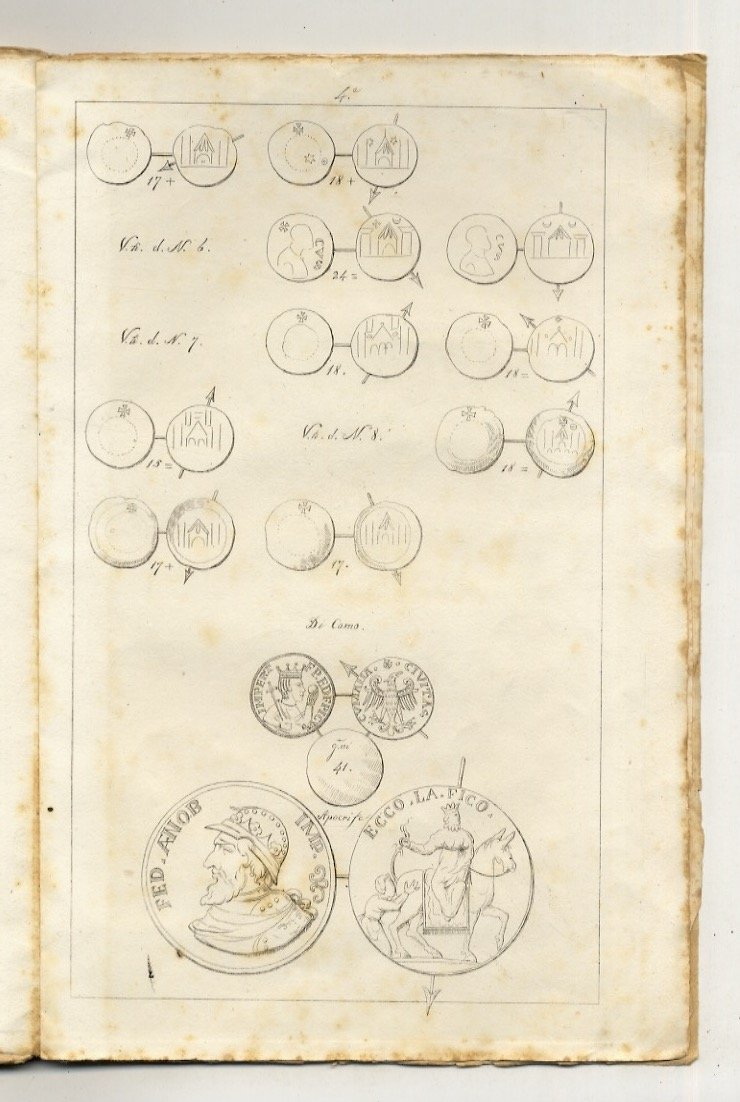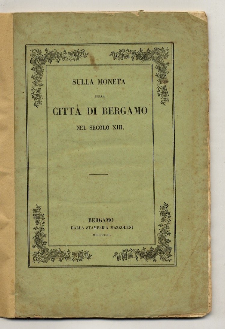 Bergamo, dalla Stamperia Mazzoleni, 1842, in-4, br. fittizia (conservata all'interno la copertina anteriore della brossura editoriale), pp. 78 + 4 tavole incise in rame (monete). Lievi fioriture. Prima edizione, rara. Ex-libris araldico.