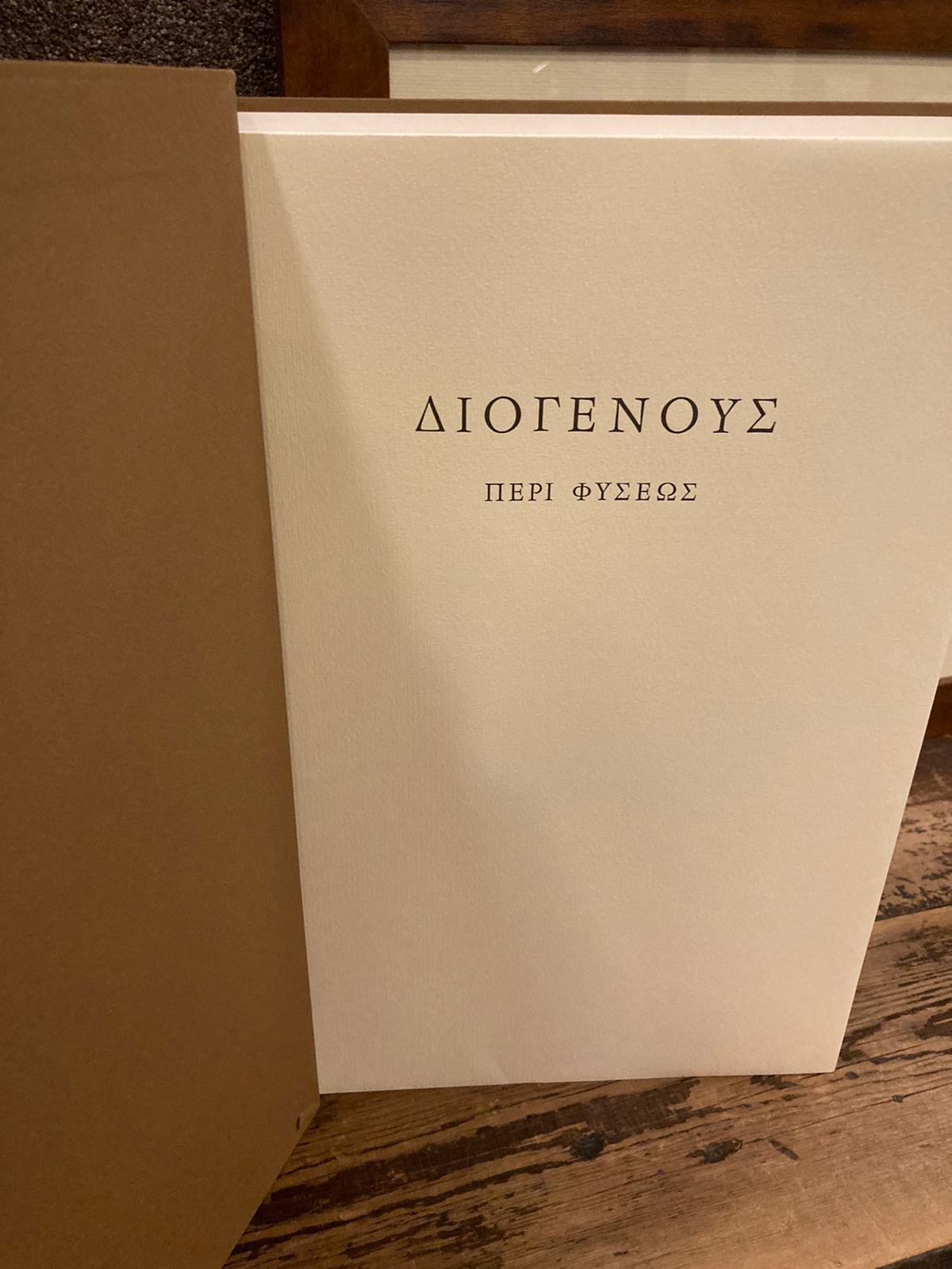 In-4° (33x21 cm), pp. 37, (11), brossura editoriale incamiciata crema con titoli in nero al dorso e al piatto anteriore. Cartella e astuccio in cartone rigido tabacco editoriali. Edizione composta a mano con i caratteri Caslon Elzèvir. Ottimo esemplare della tiratura di 180 su carta velina Magnani. Edizione italiana di riferimento. Testo e annotazioni di Jean Zafiropulo. Testo greco originale e traduzione italiana a fronte.