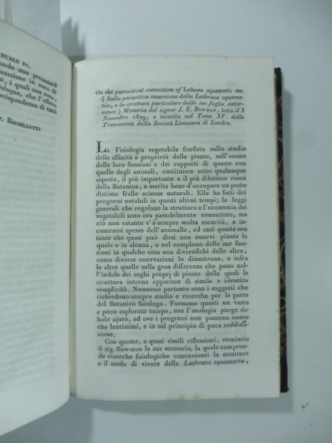 Sulla parasitica inserzione della Lathraea squamaria e la struttura particolare delle foglie sotterranee. memoria di J. E. Bowman.(Stralcio da: Nuovo giornale de' letterati. N. 71. 1833)