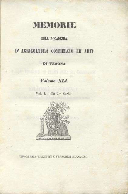 Due saggi contenuti in "Memorie dell'Accademia d'Agricoltura, Arti e Commercio di Verona", vol.XLI. Cm.24,2x16. Pg.426. Brossura editoriale. Esemplare in barbe. I due scritti constano rispettivamente di 48 e 154 pagine. > Cavanna, "Elementi per una bibliografia italiana intorno all’idrofauna, agli allevamenti degli animali acquatici e alla pesca", 52. Codice libreria 152488.