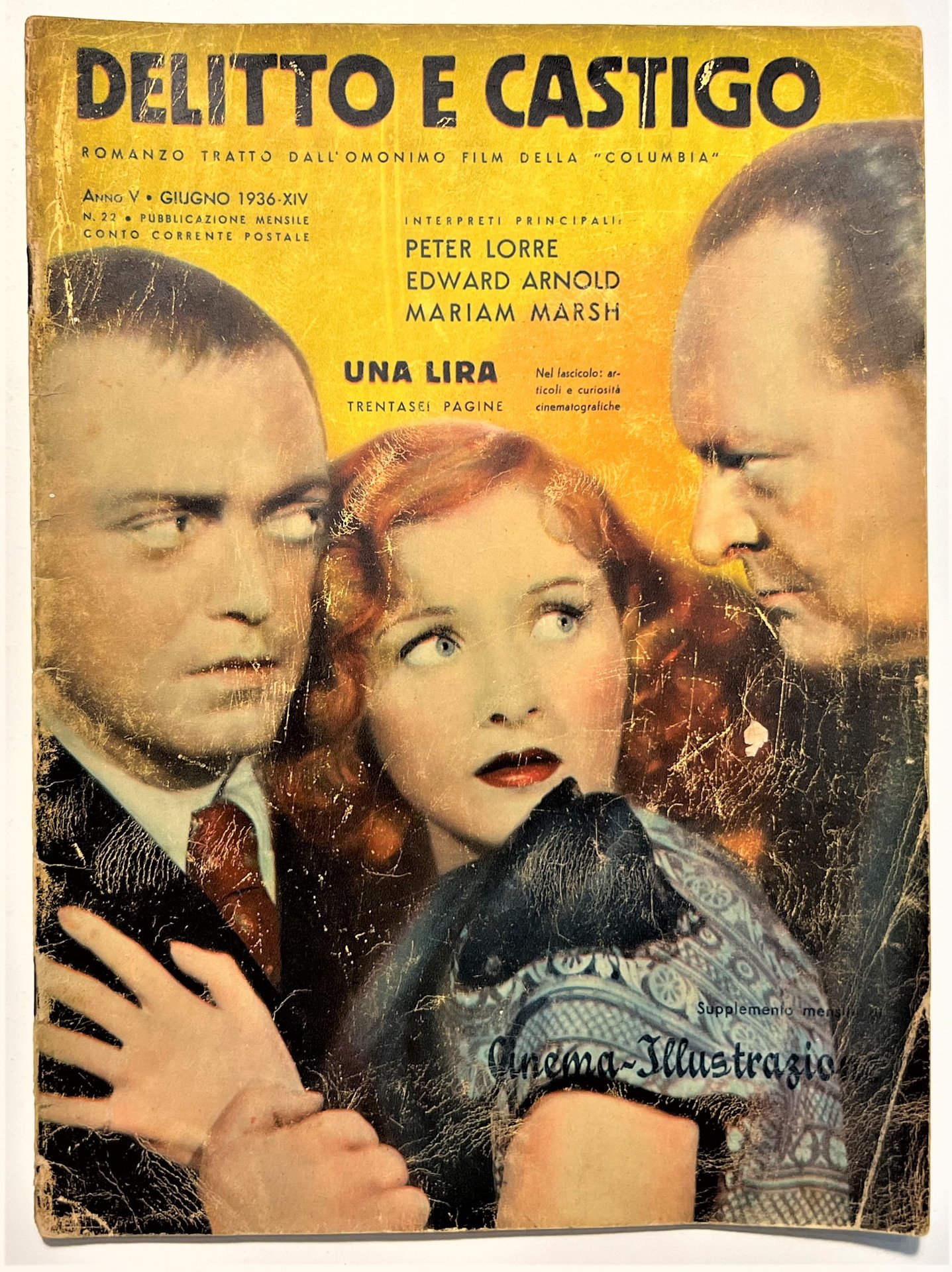 Supplemento al Cinema-Illustrazione N. 22 - 1936 Romanzo Delitto e Castigo - Peter Lorre, Edward Arnold e Mariam Marsh Testo in lingua italiana. Pagine 34 con illustrazioni. Copertina morbida. Condizioni molto buone con piccoli segni del tempo come da foto.