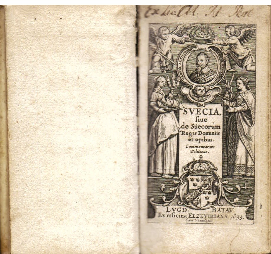In-24° (115x61mm), pp. (6), 306, (1), legatura coeva p. pergamena rigida con unghie e con titolo manoscritto in antico alla cuffia superiore. Frontespizio figurato inciso su rame con ritratto di un re svedese incoronato da due angeli, uno dei quali brandente una spada, due figure allegoriche femminili, il blasone dei Re di Svezia. Testatine e capilettera ornati in tecnica xilografica. Antico ex-libris manoscritto al margine superiore del frontespizio. Esemplare assai bello con qualche usuale e leggera brunitura. Seconda edizione, posteriore di due anni alla prima, di questa summa della storia svedese pubblicata con tipi elzeviriani; la prima parte, “geographica et politica descriptio”, è composta da Andreas Bureus (1571-1646), mentre le restanti sono dovute alla penna di Henrik Soter (XVI-XVII secolo). Willems, Les Elzevier, 394. Rahir, 340. Warmholtz, 6694. Berghman, 1803. Collijn, col. 900. 24mo (115x61mm), pp. (6), 306, (1), contemporary binding in full vellum with squares and anciently handwritten title on the upper spine-end. Figurated title-page engraved on copper with a portrait of a swedish king crowned by angels, allegorical figures, etc. Some customary foxing. A very good copy. Second edition - the first edition was printed two years before - of this summary of the history of Sweden printed by the Elzeviers. The first part, “Geographica et politica descriptio”, was written by Andreas Bureus (1571-1646), while the other parts were composed by Henrik Soter (XVI-XVIIth Century).
