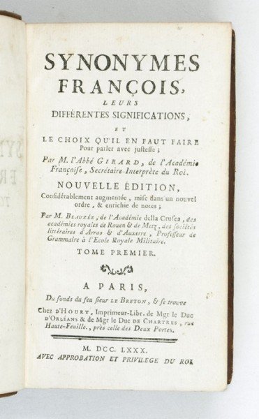 Synonymes françois, leurs différentes significations, et le choix qu’il en faut faire pour parler avec justesse. Tome premier (-second). | Libri antichi e moderni | Girard, Gabriel, Abbé.
