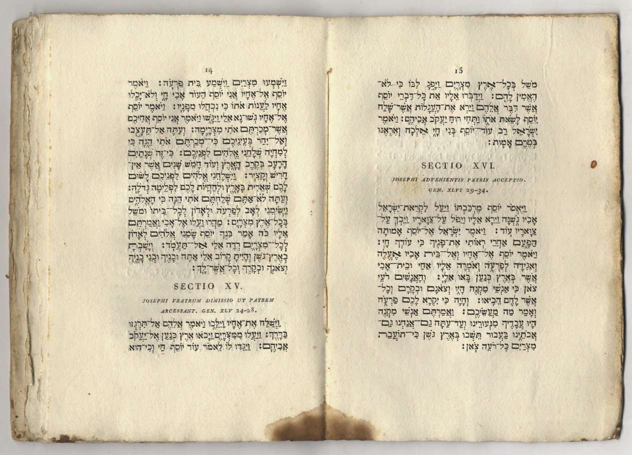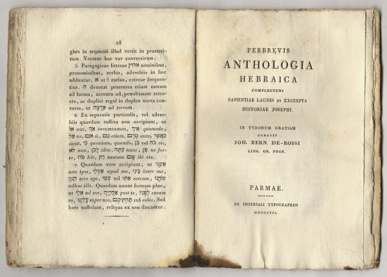 Synopsis institutionum hebraicarum. Edidit Joh. Bern. De-Rossi [.]. [legato con:] DE ROSSI Giovanni Bernardo, a cura di. Perbrevis Anthologia hebraica complectens laudes et excerpta historiae Josephi [.].