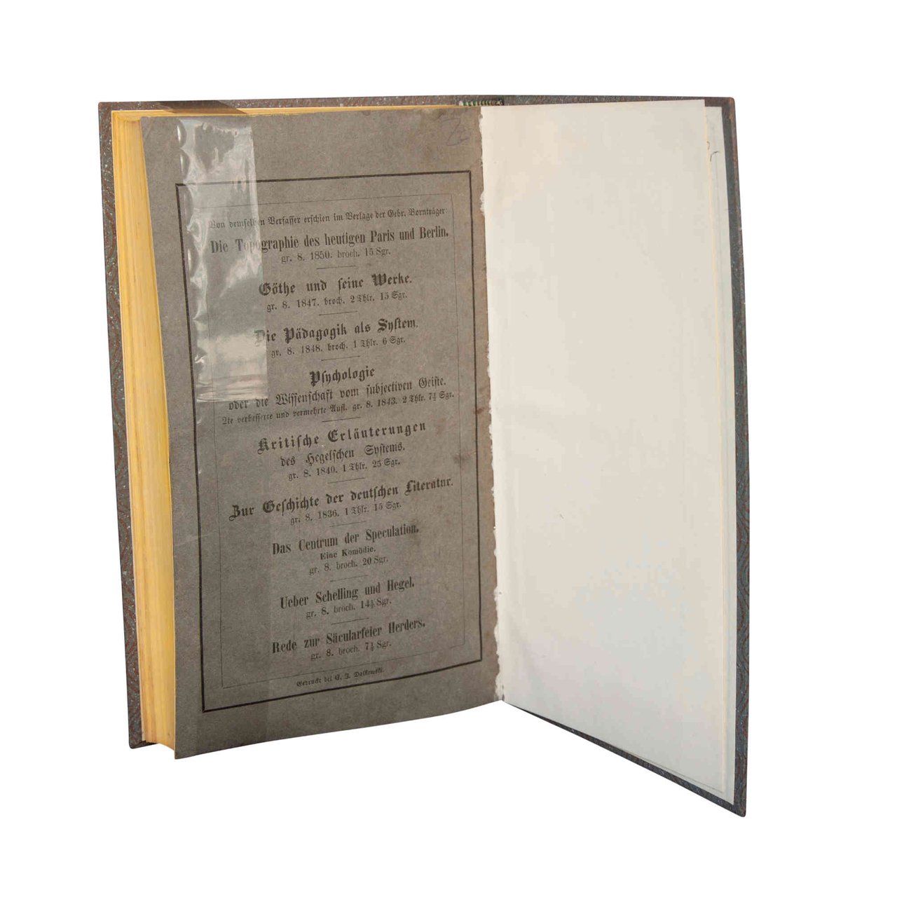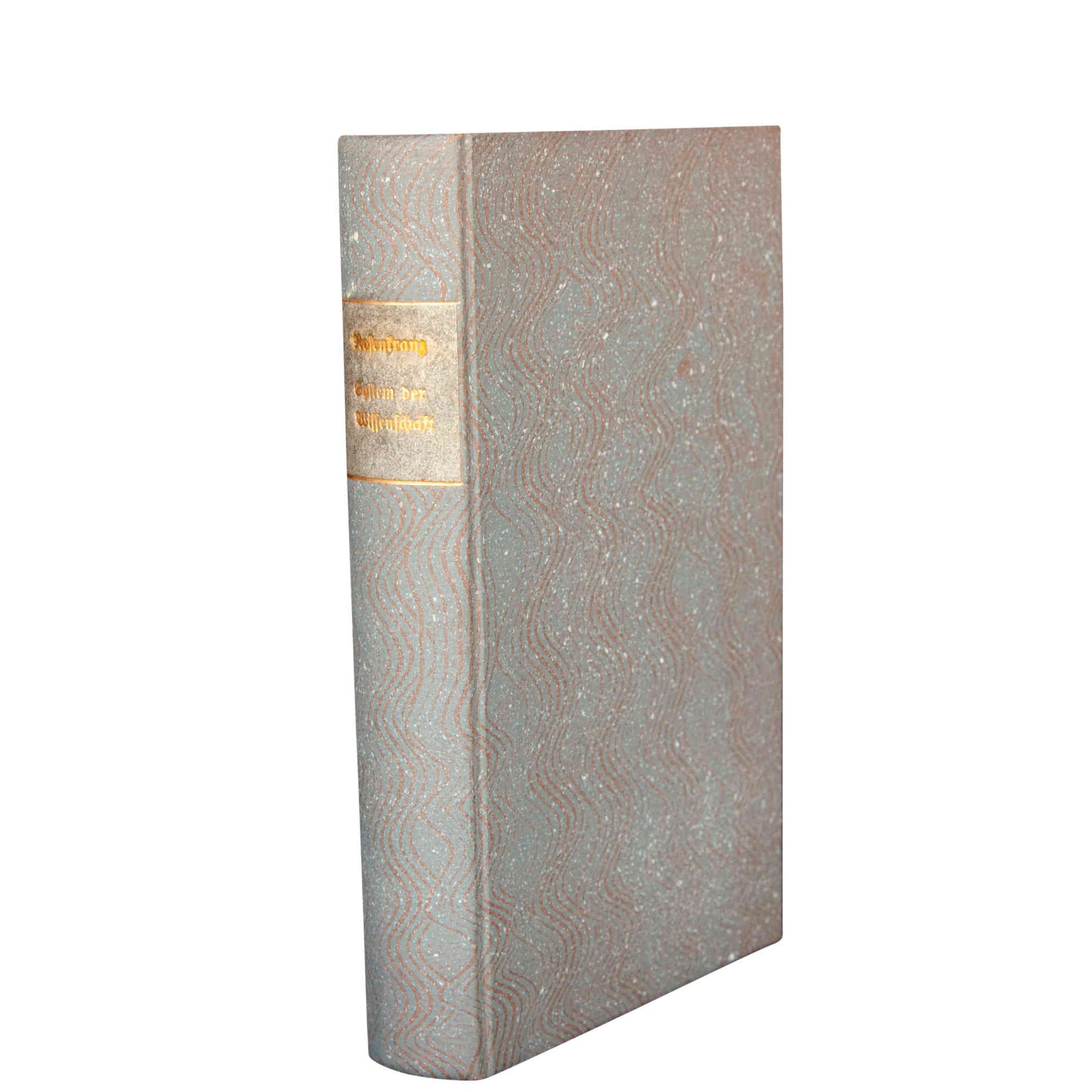 First edition of this rare treatise about the methodology of science by Hegelian philosopher Karl Rosenkranz. – Contents, Author: Karl Rosenkranz (1805-79) was one of the core protagonists of moderate Hegelianism in his times and Hegel's only contemporary biographer (1844). In »System of Science« Rosenkranz elaborates his methodology of science, particularly influential for Italian philosophers of the 19th ct. (Vera, Mariano, del Zio) as well as for William Torrey and the »St. Louis School of Thought« in the U.S. The rear wrapper contains a list with Rosenkranz' works published by Königsberg publisher Bornträger. – Condition. Binding skilfully renewed, the original grey wrappers are bound in at the end of the volume; front wrapper with fault, paper occasionally with slight foxing, otherwise well preserved. – Rarity: Though well represented at auctions with his other works (e.g. the seminal »Ästhetik des Häßlichen« (1853) this book by Rosenkranz is particularly hard to find in trade and at auctions. As of Dec. 8th 2022 JBP/ JAP/APO and RBH show only one single auction result at all (1965). – Reference: Butzlaff, Joachim: „Rosenkranz, Johann Karl Friedrich“: NDB, on-line. URL: http://daten.digitale-sammlungen.de/bsb00016410/image_84. 14th August 2022.