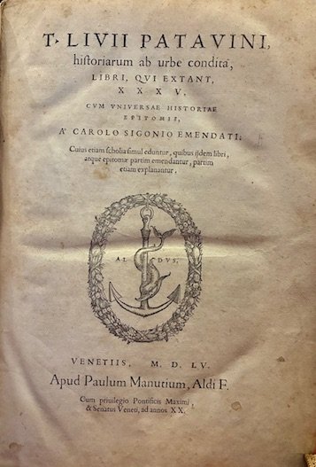 Folio (cm. 32,8), 4 cc.nn., 478 cc., 98 cc. (compreso un secondo frontespizio), 40 cc. Ancora aldina ai due frontespizi. Numerosi capilettera xilografici n.t. Solida legatura seicentesca in piena pelle con nervi, ricchi fregi e titolo oro su tassello rosso al ds. (tracce d’usura marginali, lievi abrasioni ai piatti, fenditure alle cerniere e mancanze alle cuffie). Carte di guardia marmorizzate. Alone di sofferta umidità all’angolo inferiore delle ultime trenta carte, altrimenti esemplare fresco, con buoni margini ed in ottimo stato di conservazione. Prima edizione di Livio curata dallo storico bolognese Carlo Sigonio (1520-1584) e prima edizione assoluta dei suoi dotti commenti e delle sue tavole cronologiche. Renouard (166.15): ‘Belle edition bien imprimée, sur bon papier, et peut-etre de toutes celles de cet histoire, la plus amie de l’oeil et la plus facile a lire. Celle-ci, de 1555, est fort rare et ne se trouve presque jamais qu'en très mauvaise condition’.