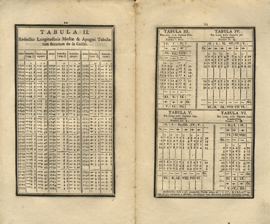Tabulae lunares Tobiae Mayeri novae et correctae juxta editionem londinensem anni MDCCLXX ad meridiano parisinum reductae et pro facilitando calculo sic dispositae ut omnes aequationes positivae sint. Praemissa differentia inter novas solares tabulas Mayeri et tabulas de La Cailli. A P. Antonio Pilgram, S.J.