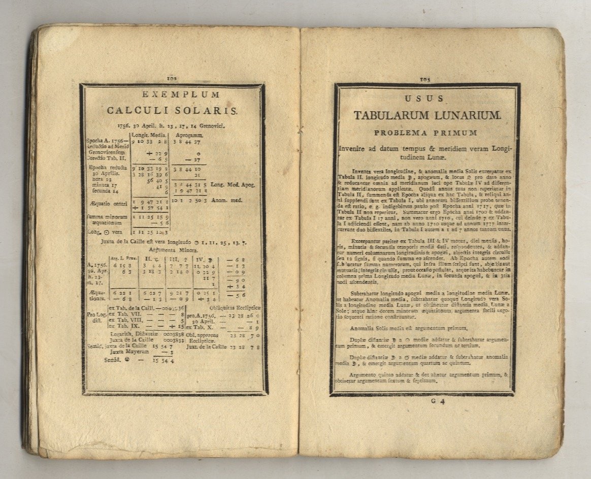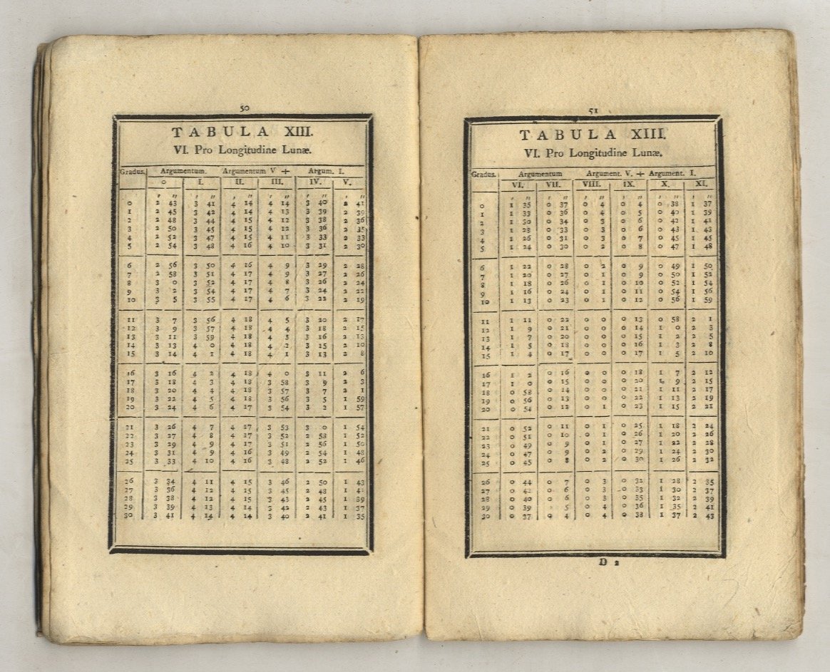 Vindobonae, typis Ioannis Thomae nob. de Trattnern, 1771, in-8, cartonatura marmorizzata coeva (priva del dorso), pp. 109. Mancano tre tavv. f.t. Le “Tabulae" del Mayer ebbero una grande importanza nella determinazione della longitudine e furono pubblicate postume a Londra nel 1770.