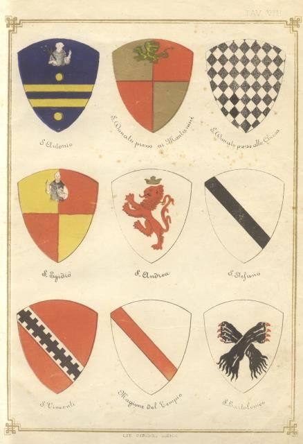Tavola di stemmi in cromolitografia. N°VIII: Stemmi di Sant'Antonio, San Donato presso ai Montanini, San Donato presso alla Chiesa, S. Egidio, S. Andrea, Santo Stefano, San Vincenti, Magione del Tempio, San Bartolomeo. 1880 circa.