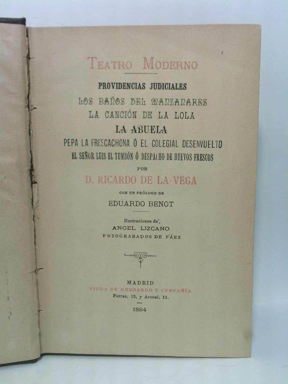 TEATRO MODERNO. [Tomo III. QUE CONTIENE LAS SIGUIENTES OBRAS]: Providencias judiciales; Los baños del Manzanares; La canción de la Lola; La Abuela; Pepa la frescachona ó el colegial desenvuelto; El Señor Luis el Tumbón ó despacho de huevos frescos / por Ricardo de la vega; Prólogo de Eduardo Benot; Ilustraciones de Angel Lizcano; Fotograbados de Páez