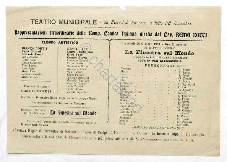 Teatro Municipale Alessandria - Locandina commedia La Finestra sul Mondo 1900 ca