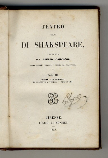 Teatro [.] tradotto da Giulio Carcano. Prima edizione fiorentina riveduta dal traduttore. Vol. III: Otello. La Tempesta. Il Mercante di Venezia. Arrigo VIII.