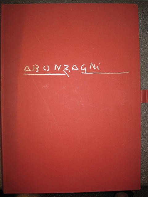 Cartella editoriale in-folio elefante (515x373mm) in t. tela rossa con riproduzione in oro al piatto della firma del Bonzagni. Contiene 7 ff. sciolti di testo impresso unicamente al recto (frontespizio, prefazione di Bettino Craxi, testo introduttivo di Paolo Pillitteri, biografia del Bonzagni, elenco di mostre personali e collettive negli anni 1979-1983, opere in musei e gallerie d'arte italiane ed estere, elenco finale delle tavole) e 14 riproduzioni sciolte di tempere realizzate nel 1912 dal Bonzagni per il giornale diretto da Claudio Treves 'Avanti della Domenica', aventi come propri soggetti il Primo Maggio e il socialismo, la Guerra di Libia, ecc. Perfetto stato. Volume promosso dalla Cassa di Risparmio di Cento, città in cui l'artista era nato nel 1887.