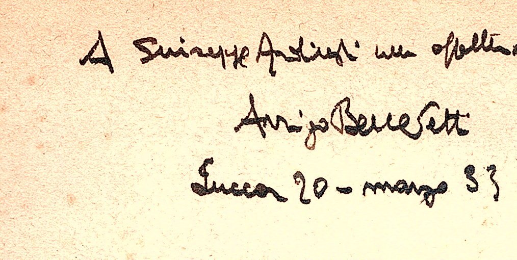 In-8° (20x13 cm), pp. 87, (1), brossura editoriale con titoli al piatto anteriore figurato silograficamente (Maccari Mino). Collana Documenti. Ottimo esemplare entro velina con dedica autografa dell'autore alla carta bianca anteriore. Rara prima edizione di opera prima. Ricordi autobiografici nel lucchese della Prima guerra mondiale. Cfr. Gambetti-Vezzosi, p. 79.