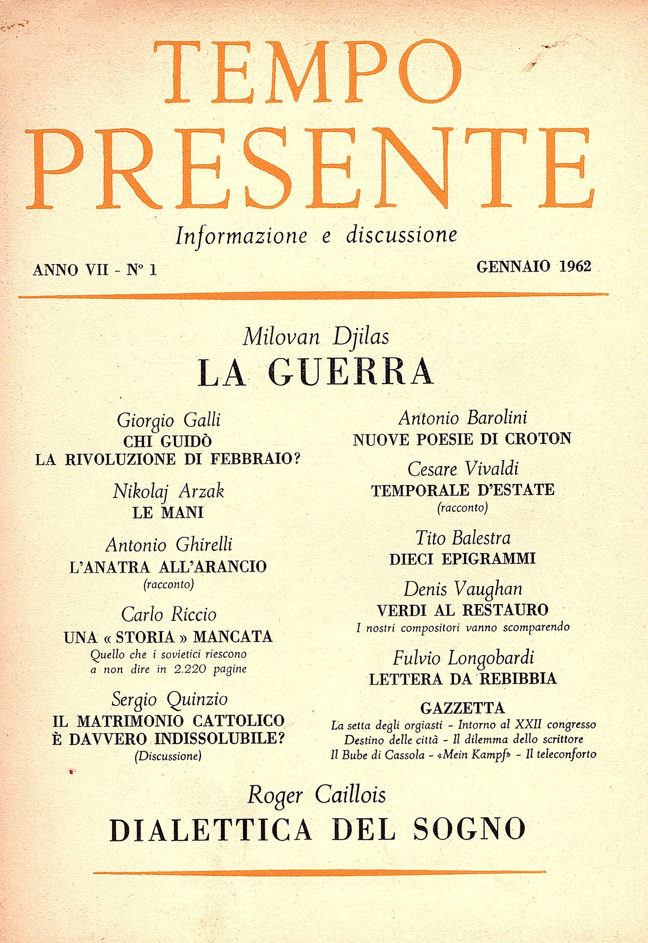 Tempo presente. Informazione e discussione Anno VII, N° 1 Gennaio & N° 2 Febbraio 1962