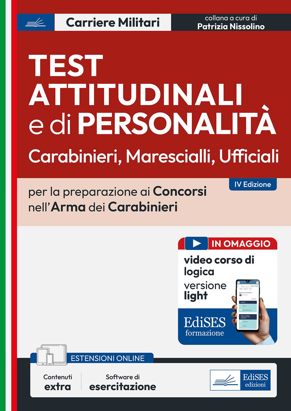 Volume per la preparazione ai test attitudinali e di personalità previsti dai concorsi nell'Arma dei Carabinieri (per i ruoli Carabinieri, Marescialli e Ufficiali) Il volume è suddiviso in tre parti: Indicazioni sull'Arma dei Carabinieri Lineamenti generali dell'Ordinamento e della struttura dell'Arma dei Carabinieri. Prova di efficienza fisica, accertamenti psico-fisici e accertamenti attitudinali per l'accesso all'Arma dei Carabinieri La prova di efficienza fisica nei concorsi dell'Arma dei Carabinieri; gli accertamenti psico-fisici nei concorsi dell'Arma dei Carabinieri; gli accertamenti attitudinali nei concorsi dell'Arma dei Carabinieri. I test attitudinali, della personalità e colloquio Teoria ed esempi pratici di test psico-attitudinali. In particolare: test della personalità; colloquio psicologico e attitudinale; test attitudinali di logica verbale, ragionamento critico, ragionamento numerico, ragionamento astratto, ragionamento spaziale. In omaggio, oltre a una serie di approfondimenti, anche il software di esercitazione online.