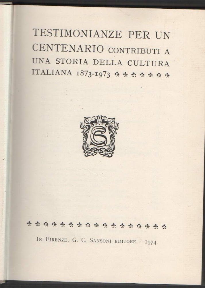 TESTIMONIANZE PER UN CENTENARIO. CONTRIBUTI A UNA STORIA DELLA CULTURA ITALIANA 1873-1973 (1974)