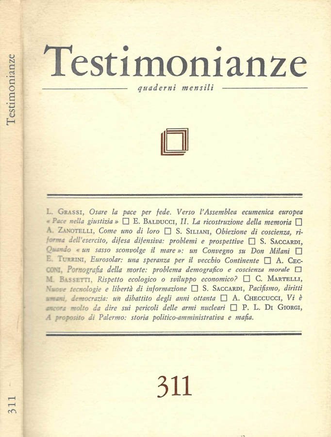Quaderni mensili Testimonianze, anno XXXII. (32), Gennaio 1989, n. 1, n. 311 di collana, direttore Lodovico Grassi. N. pag. 119. Brossura filo refe, copertina leggermente alonata da impronte di umido e polvere, lieve compressione ai piatti, interno integro ben tenuto leggermente ossidato, minimo pulviscolo ai tagli.