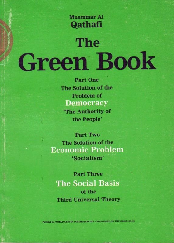 In-16°, in brossura editoriale, pp. (4)104(4). Nel celebre testo Gheddafi espone la sua visione della democrazia e dell'economia: rigettando l'insieme dei principi della democrazia liberale, propone delle nuove idee basate sul Socialismo nazionale, Panarabismo, Democrazia diretta e Conservatorismo. Il libro è diviso in tre parti: Parte politica: l'autorità del popolo; Parte economica: il socialismo; Basi sociali della terza teoria universale.