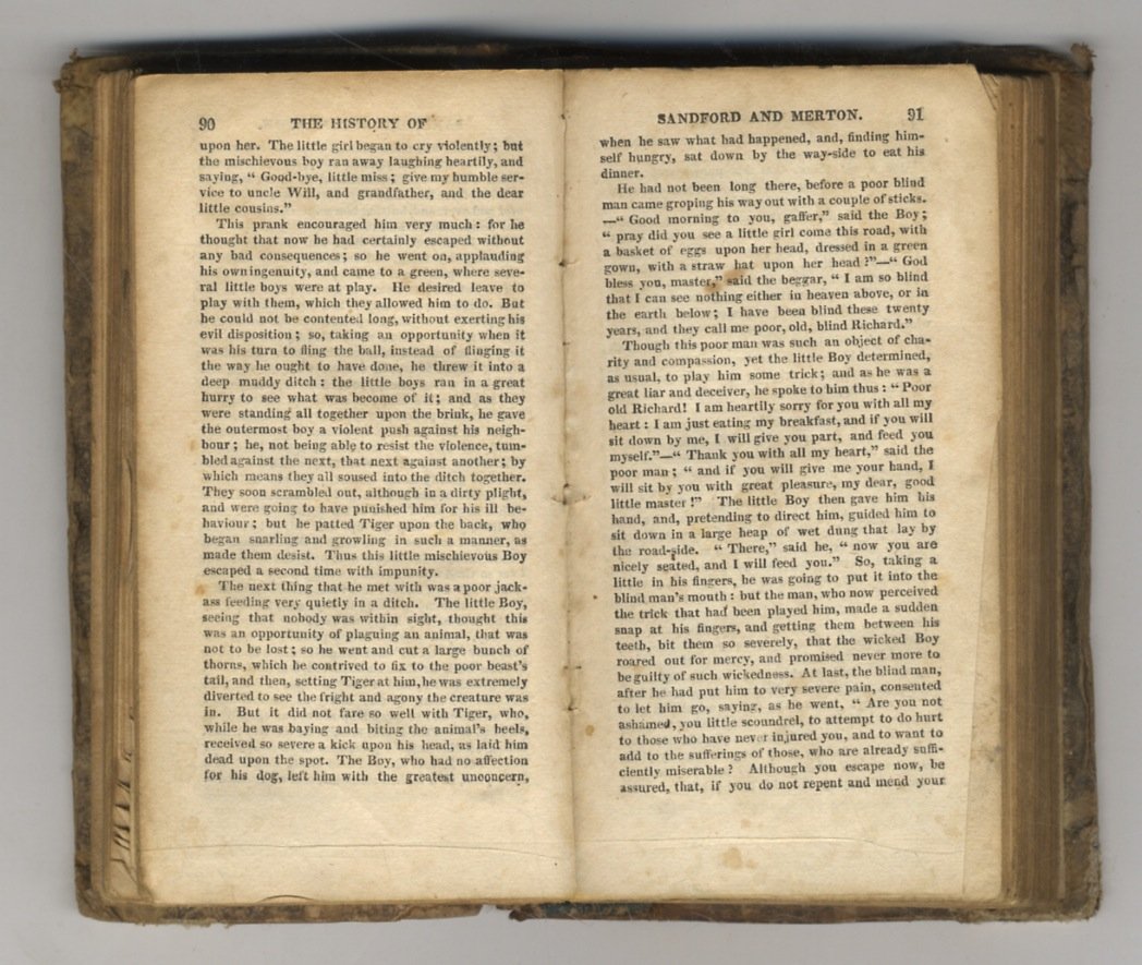 London, Printed for J. Walker (et al.), 1808, in-12, mezza pelle coeva con titolo e filettature oro al dorso, pp. XII, 420. Erosioni al dorso ed ai piatti, con carta di copertura a tratti mancante. Asportato uno dei 2 frontespizi, quello inciso (scena coi 2 fanciulli della storia: il ricco Thomas Merton, il virtuoso Harry Sandford ed il tutore: il romanzo, all'epoca un bestseller, s'ispira alle idee educative di Rousseau). Firma e nota manoscritte datate 1827.