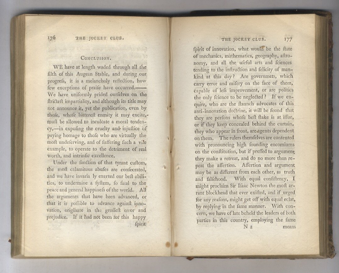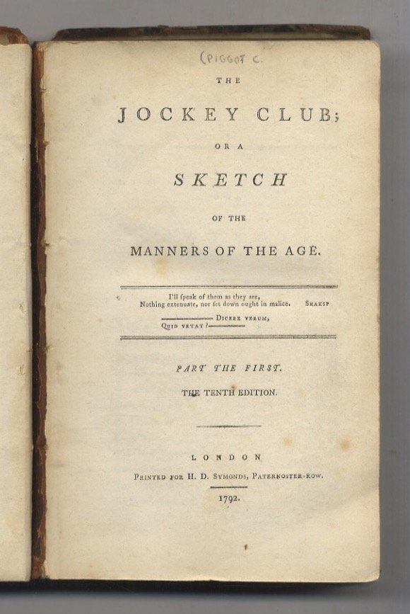 London, H.D. Symonds, 1792, voll. 2 legati in uno, in-8, mezza pelle coeva (piatti staccati, difetti al dorso), pp. (16), 194 - (30), 191. “The ‘Jockey Club' contained satirical character sketches of the Prince of Wales and leading members of the establishment, whilst the ‘Female Jockey Club' had a similar look at leaders of society, both male and female, concluding with the ‘Blue Stockings'.
