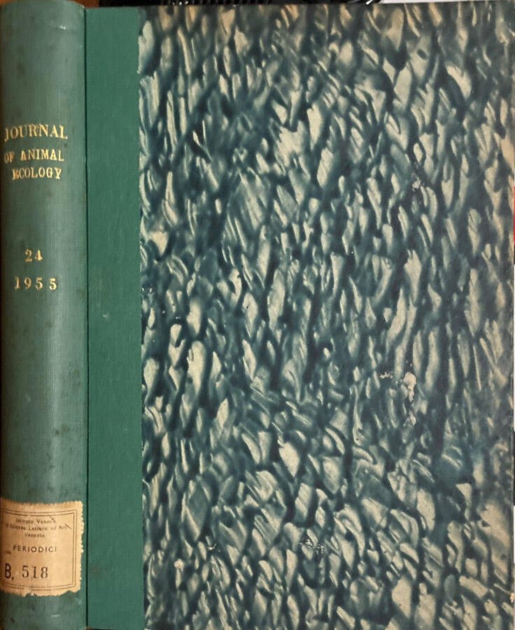 Volume 24 1955, completo, composto da due numeri, No.1 ,may, e No. 2, november, del periodico semestrale The Journal of Animal Ecology, a cura di H.C. Gilson,per conto della British Ecological Society, copertine originali per ciascun numero. Rilegato con copertina rigida cartonata effetto marmorizzato, titoli in oro al dorso. Segni del tempo e d'usura; fioritura al dorso,cuffie e punte sciupate, abrasioni al piatto anteriore, fioritura ai tagli ingialliti. All'interno la legatura è stabile, catalogazione bibliotecaria manoscritta a penna alla copertina del primo numero, pagine ingiallite soprattutto ai margini, integre, le pp. 251,252,253,254 segnate da fioritura che non ne compromette la fruibilità. Disegni in bianco e nero nel testo. Presenti etichetta e timbri dell'Istituto Veneto regolarmente acquisite dalla nostra biblioteca. Numero di pagine 539.