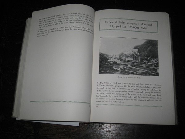 In 8, pp. LXIII + 430, tela verde con titolo in bianco (sbiaditure e aloni alla legatura). Numerosissime illustrazioni fotografcihe n.t., anche a piena pagina, e una grande carta geografica. Buon esemplare. Monografia sulle principali industrie metallurgiche presenti in Italia, dalla FIAT alle fonderie milanesi all'industria cantieristica genovese. Ricchissimo l'apparato iconografico, sono descritte le ferriere di Voltri, la Metallurgica Ossolana, le miniere di Traversella, le fonderie di Piombino, le miniere di Monteponi e moltissime altre. A cura dell'Associazione fra gli Industriali Metallurgici Italiani.