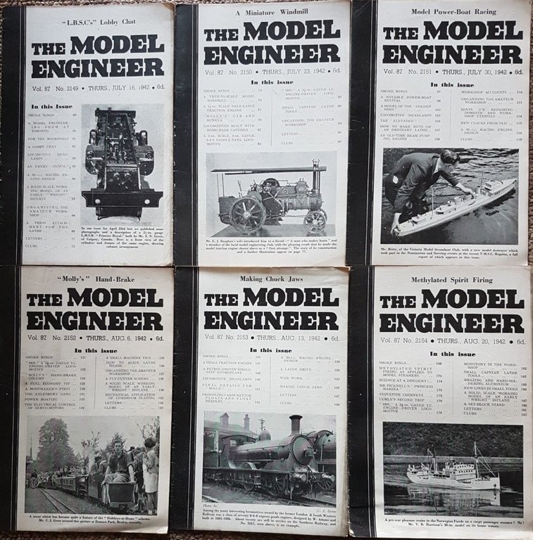6 Editions from 1942. Condition very good to fair. Some minor marking and creases, small tears and rubbing. 6 x 24pp. Six issues of Model Engineer produced during World War 2. A careful examination of the image shows the contents of each issue.
