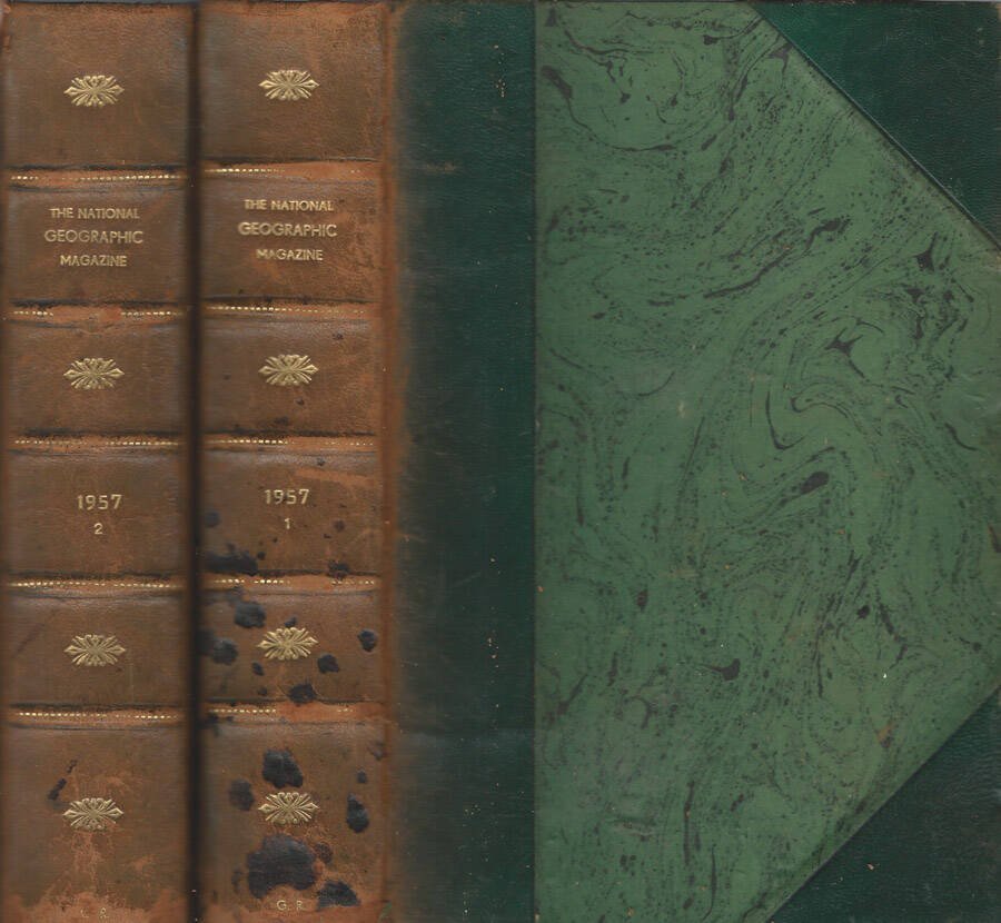 Opera completa in 2 volumi rilegati in mezza pelle, titoli in oro al dorso, piatti, contropiatti e risguardi illustrati a colori, irregolarità alle cerniere e alle punte, testi in ottimo stato, raccolta completa dell'annata 1957 della rivista "The National Geographic Magazine" nella edizione originale americana pubblicata dalla National Geographic Society, con numerosissime fotografie a colori e in bianco e nero e con carte contenute in astuccio in terza di copertina, [volume I] anno 1956 pag. n. 874, "Gennaio - Giugno" [volume II] anno 1957, pag. n. 868, "Luglio - Dicembre". Numero pagine 1742