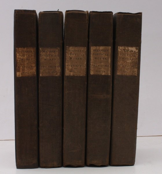 5 vols., sm. 8vo., on laid paper (dated 1824), with engraved portrait frontispiece, 'wreath' titles, some very light spotting and dust-soiling to text, fore-edges dusty, neat and uniform nineteenth century signature on front paste-downs; original brown [puce?] cloth, backstrips with original paper labels lettered in black, uncut and partially unopened, first volume expertly recased, third volume with small 'pull' at headband else a very good, firm set in minimally restored early cloth binding. THE SET IS COMPLETE WITH ALL HALF-TITLES. It includes Philip Masterman's 'Essay on the Life and Writings of Edmund Spenser' and an extensive glossary. The portrait is engraved by Worthington. The titles carry Pickering's distinctive 'wreath'. '[The books of Pickering's Wreath Series] possess in common an exceedingly pleasant format, and on their title-pages is his beautiful and individual wreath ornament usually [as here] with the motto 'Perennis et frgrans'. This ornament served to all intents and purposes as Pickering's 'device' in the books which he published in the years 1825 and 1826' (Keynes, pp.16-17). The work was an early product of his collaboration with co-publisher Talboys and Wheeler of Oxford. Pickering produced his first commercial cloth binding for his 'Diamond Classics' series of the early 1820s. 'He was afterwards imitated by other publishers, but the smooth red, magenta, puce or dark blue cloth used by Pickering remained for many years the distinguishing mark of his books. The innovation thus quietly made by Pickering in 1820 has had its effect on the whole subsequent history of the publishing trade in England, and but for him boards or paper covers for books might now be considered to be just as inevitable in this country as they still appear to be on the continent of Europe' (Keynes, pp.14-15). A MOST ATTRACTIVE COPY IN SPLENDID, MINIMALLY RESTORED BINDING FROM ONE OF THE FOUNDERS OF PUBLISHER'S CLOTH. This copy is bound in Pickering's characteristic dark brown 'puce' shade rather than the red cloth seen by Keynes. Keynes, p.90 (with asterisk denoting 'special merit').