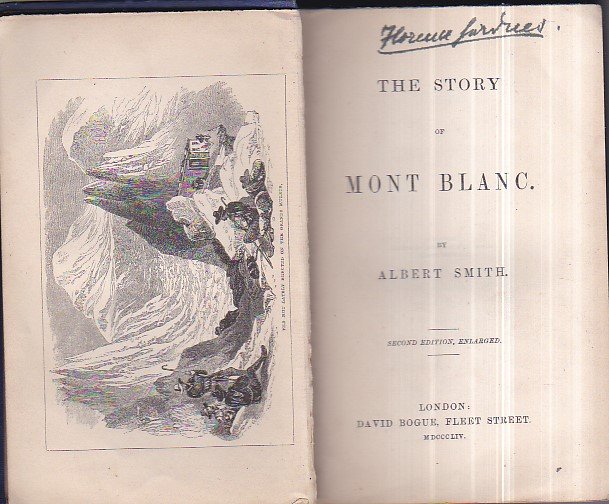 In-16°, pp. XVI, 299, (4), legatura editoriale p. percallina blu con cornice a secco ai piatti, titolo, fregi e illustrazione in oro al dorso. Antiporta xilografica con veduta del bivacco di Grands Mulets, 25 illustrazioni xilografiche del Beverley n.t. Piccoli restauri a cuffie e cerniere. Una firma del tempo. Bell'esemplare. Ex-libris figurato 'Florence Onslow'. Si tratta di Gwendolen Florence Mary Guinness, Contessa di Iveagh (1881-1966), aristocratica e donna politica anglo-irlandese di tendenze conservatrici. L'ex-libris contiene la veduta della sua proprietà di Clandon House Seconda edizione accresciuta e impressa in formato più piccolo rispetto alla prima dell'anno precedente di questo grande classico della letteratura alpinistica sul Monte Bianco. 'Cet ouvrage constitue la première véritable monographie sur le Mont Blanc. Il est une des dernières manifestations de la période des 'glacières' et, par sa popularité, il a contribué a l' avènement d'une nouvelle génération d'alpinistes. Whymper, jeune homme, a notamment vu a plusieurs reprises le spectacle donné par Albert Smith a Piccadilly. Peu courant, malgré les nombreuses éditions' (Perret). Mathews, p. 316. Nava, 1/1. Neate, 715 e S86. Farquhar, 10. Lehner, Die Eroberung der Alpen, 340 e 621. Perret, 4074. Rean, 117. Il Monte Bianco nelle immagini e nelle relazioni dell'800, II, 12. ACL, p. 291. Angelini, 2236. Beer, p. 571. Peyrot, Valle d'Aosta, I, 287. S.A.C., p. 472. Garimoldi, n. 39. B.N. C.A.I.