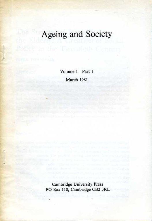 No marks or inscriptions to contents and no creasing. A very clean very tight copy with bright unmarked slightly browned paper covers and no bumping to corners. 6-28pp. Extract from Ageing and Society Volume 1 Part 1 March 1981. From the Personal Library of the late Emeritus Professor Peter Townsend of Bristol University and the London School of Economics, Founding Professor of the University of Essex and founder of the Child Poverty Action Group. We are also selling a large number of other books from Professor Townsend's Collection including many of his signed and authored works.
