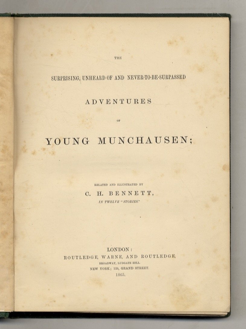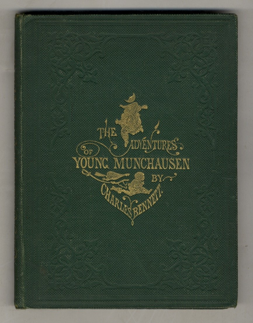 London, Routledge, Warne and Routledge, 1865, in-8, legatura editoriale in piena tela verde, titolo e figure in oro sul piatto anteriore, titolo dorato al dorso, pp. [4], 107, [1]. Con 12 tavole f.t. illustrate in b.n. e protette da veline (antiporta compresa). Prima edizione, nella rara variante in tela verde. Una serie di racconti fantastici, narrati con umorismo stravagante in dodici capitoli e brillantemente illustrati da Charles H. Bennett (1829-1867), senza alcun collegamento con il "Münchausen" di Bürger. Titolo citato anche nelle bibliografie sulla fantascienza, vedi Bleiler, Science-fiction, the Early Years (1990), n. 173. Un invio manoscritto al verso dell'antiporta. Lievi fioriture ma ottimo esemplare di questo bel libro illustrato vittoriano.