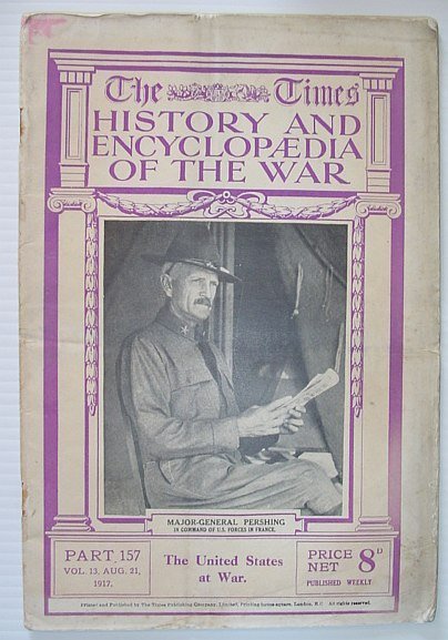 Many excellent black and white illustrations. Contents: Chapter CXCIV - The United States at War - the rupture of relations with Germany, Woodrow Wilson's Policy, Last Hopes of Peace, German Ships in American Ports, Attempts to bully Mr. Gerard, German attempts to reopen negotiations, arming of American ships, Pacifist Demonstration in Washington (with photo), more submarine crimes, text of the President's message, Military unpreparedness, German Plots, Public Opinion, The Joffre and Balfour Missions, Adoption of Conscription, The Army Draft Law, American troops for France, General Pershing, The Liberty Loan, and more. Front cover illustration of Major-General Pershing, in command of U.S. forces in France. Somewhat above-average wear. Soiling to front cover. Sound copy. Please note: readers of this part are encouraged to read Part 59 (American Opinion and the First Years of the War) and Part 140 (The End of American Neutrality). Magazine