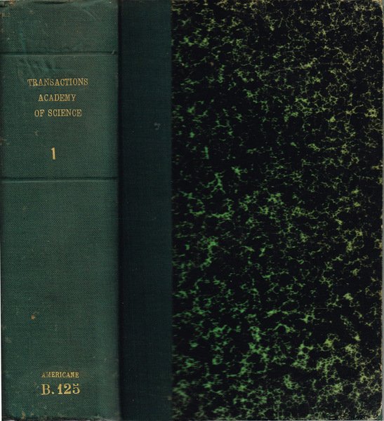 Vol. I completo, composto da scritti pubblicati dal 1856 ed il 1860, della collana The Transactions of the Academy of Science of St. Louis. Volume della seconda metà dell'800 in stato discreto, rilegato con coperta, non coeva, in mezzatela con angoli, piatti marmorizzati, sul dorso caratteri dorati in bassorilievo, bordo poco sfregato con ammaccature, lievi abrasioni, macchiette, tracce di fioritura sparsa, tagli lievemente ambrati, quello di testa di colore bordeaux, pagine discretamente conservate, alcune e margini leggermente bruniti, presenza di gora, qualcuna con becca. Il rilegatore ha mantenuto all'interno del tomo il piatto anteriore originale del I.o fascicolo, in carta spessa, con delicata cornice con fregi, timbri ex biblioteca, catalogazione bibliotecaria manoscritta. Presenta timbro ex bibblioteca su frontespizio, XXI tavole, su carta spessa, con illustrazioni in nero ed in b. e n., alcune tavole fuori formato ben piegate, qualcuna protetta da foglio di carta velina. Numero Pagine 726, numerazione delle pagine in sequenza